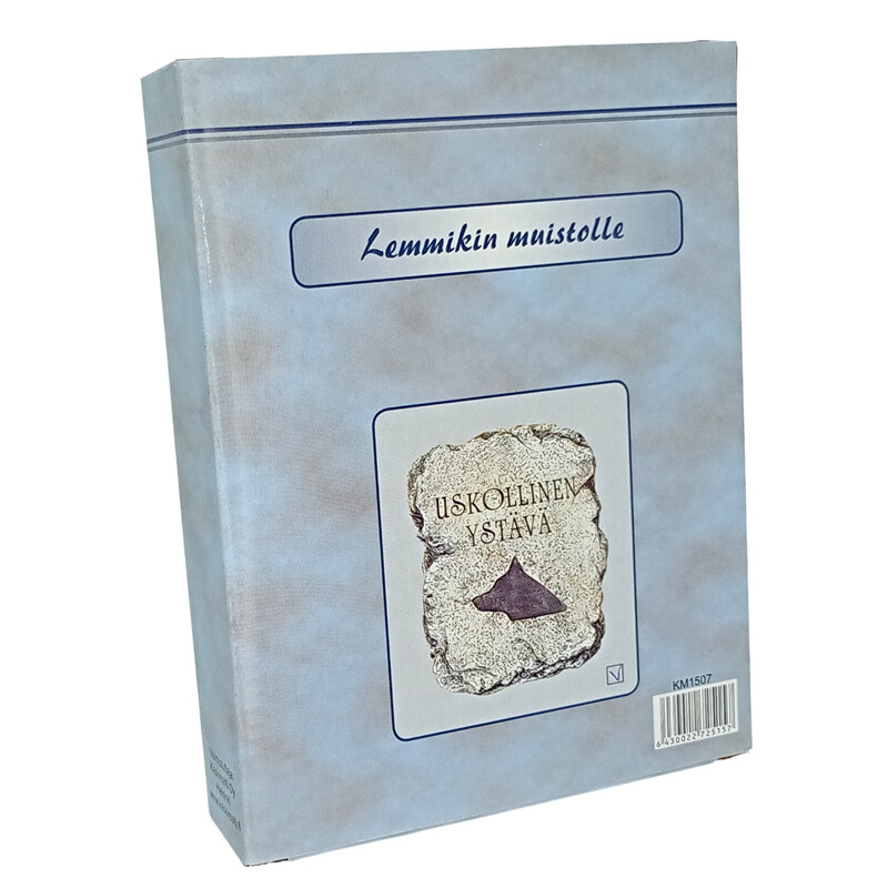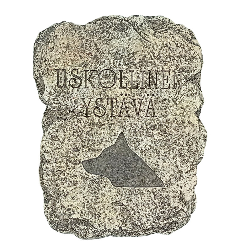 Muistolaatta koiralle. Teksti ”Uskollinen ystävä”. Laatassa on kiinnityskoukku. Laatan voi myös liimata silikonilla hautakiveen. Kestää ulkokäytössä myös talviolosuhteet. Siisti neliväripakkaus.