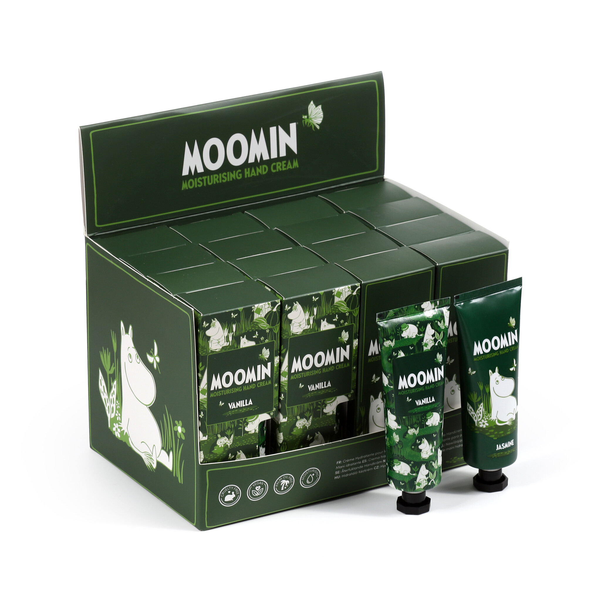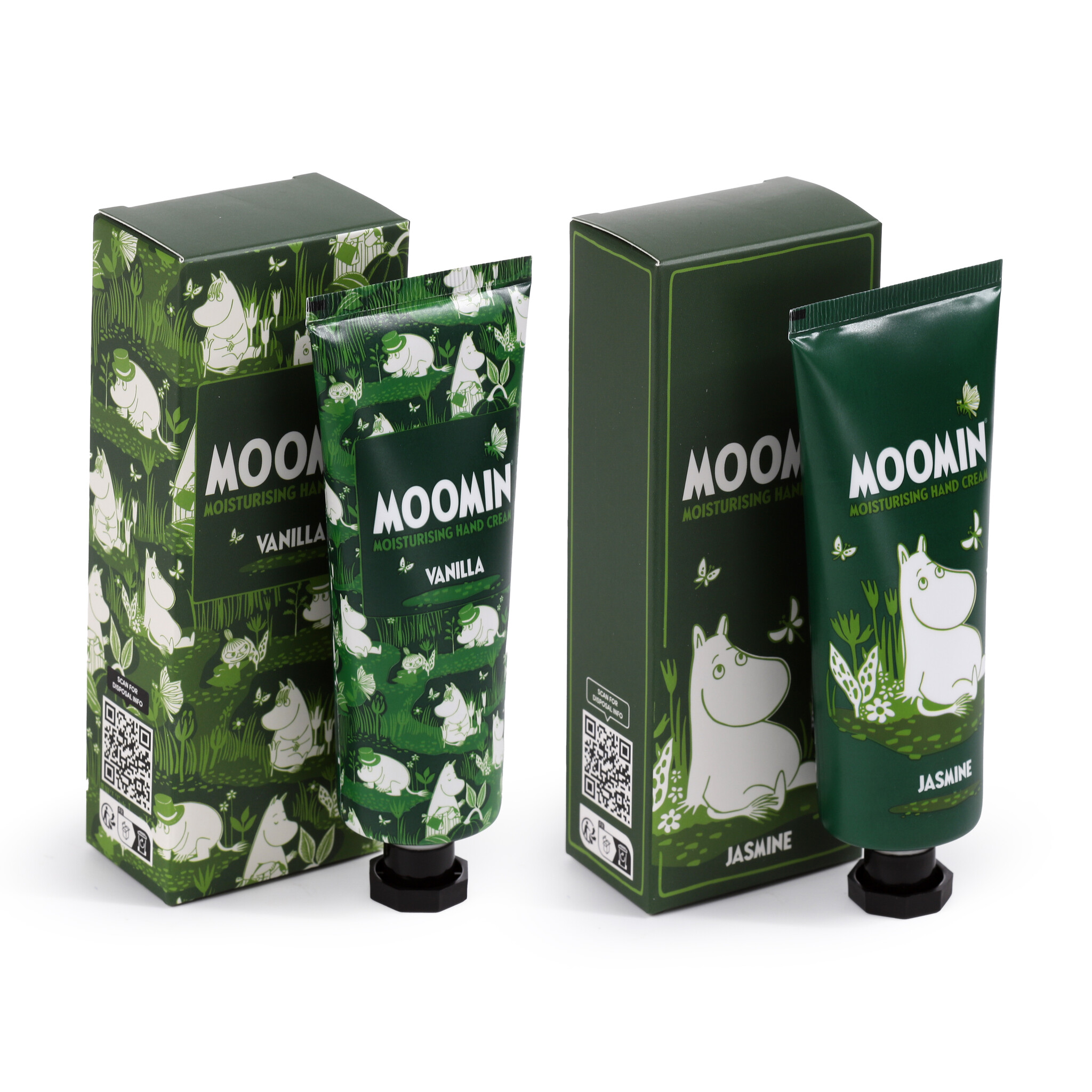 Kosteuttava käsivoide pakattuna iloisiin Muumi-pakkauksiin. Tilaamalla tuotteen saat yhden tuubin käsirasvaa kumpaakin tuoksua. Hinta on kahden tuubin yhteishinta.