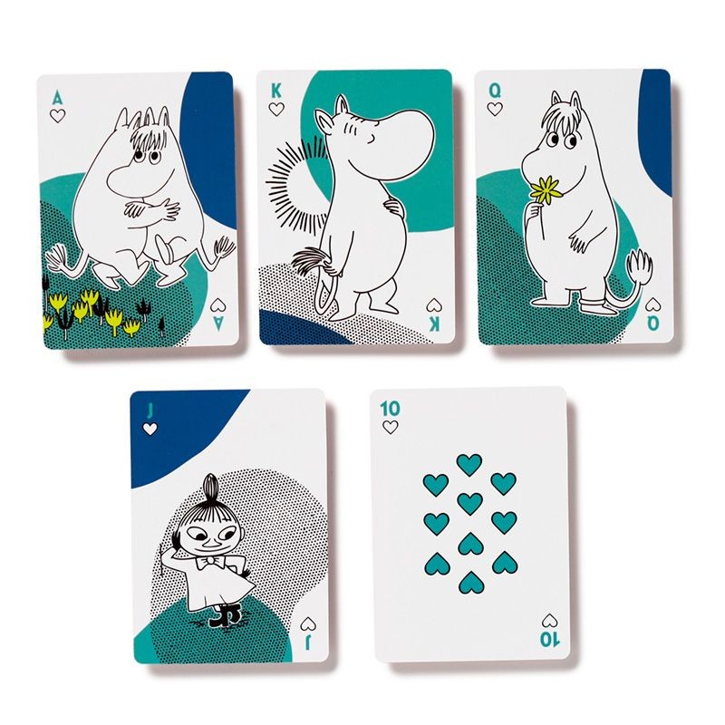 Muumi-aiheiset pelikortit. Kuvakorteissa on Muumi-kuvat.