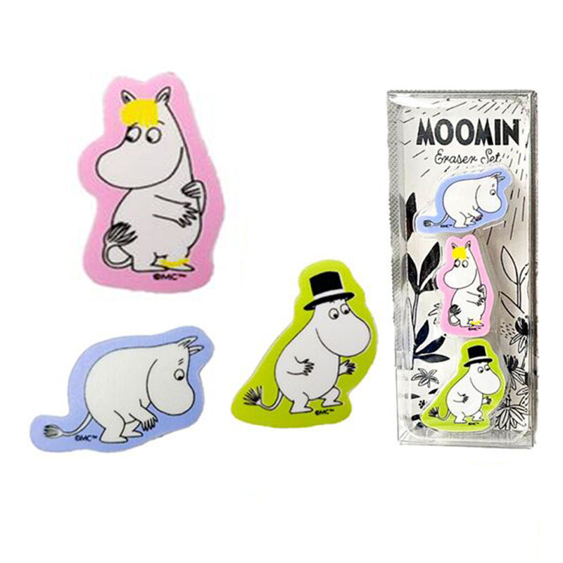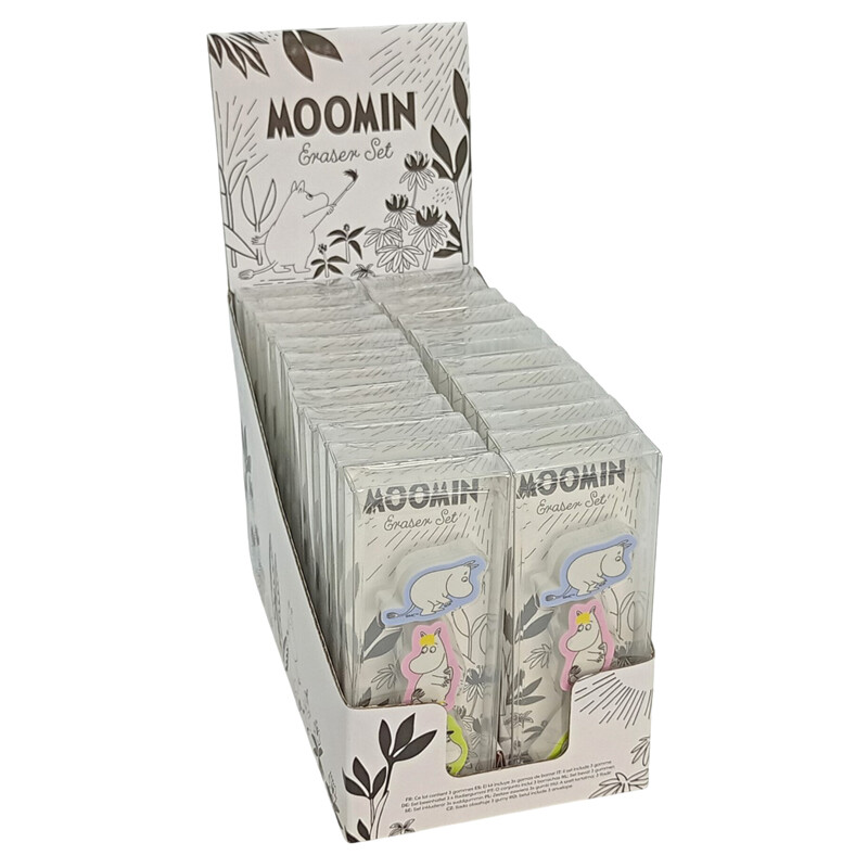 Muumi -hahmoiset pyyhekumit. Pakkauksessa on kolme erilaista pyyhekumia. Kun tilaat 24 pakkausta, niin mukana tulee myyntiteline. Hinta on yhden pakkauksen hinta.