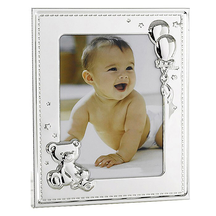 Hauska lasten kehys. Metallirunkoinen, hopeoitu ja suojalakattu. Kohokuviona nalle , ilmapalloja ja tähtiä.