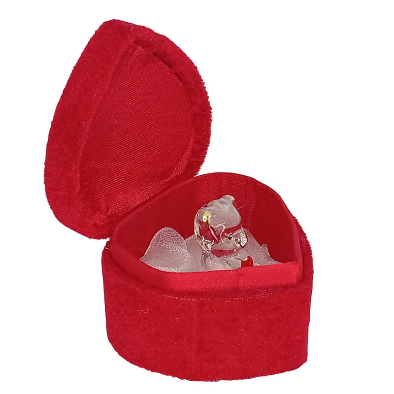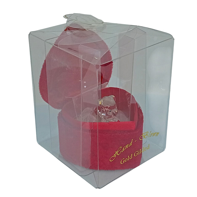 Suloinen lasinalle samettisessa punaisessa sydämenmuotoisessa rasiassa. Iloisen nallen sylisssä on punainen sydän. Sopii lahjaksi tai viemisiksi moneen juhlaan.