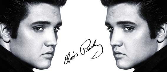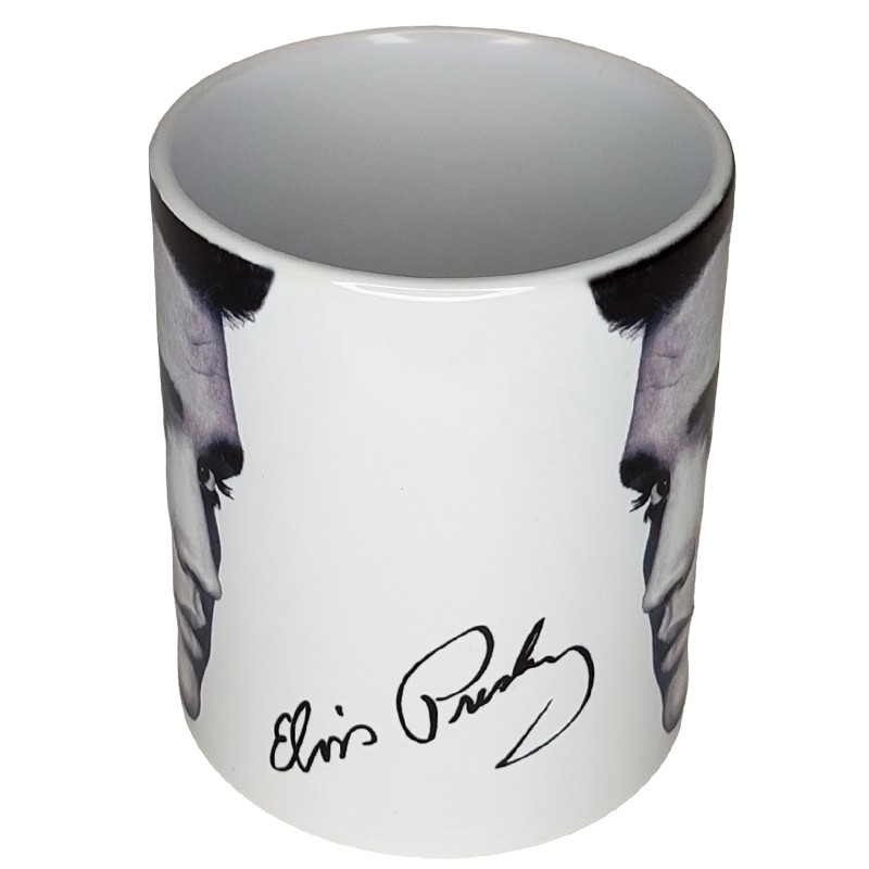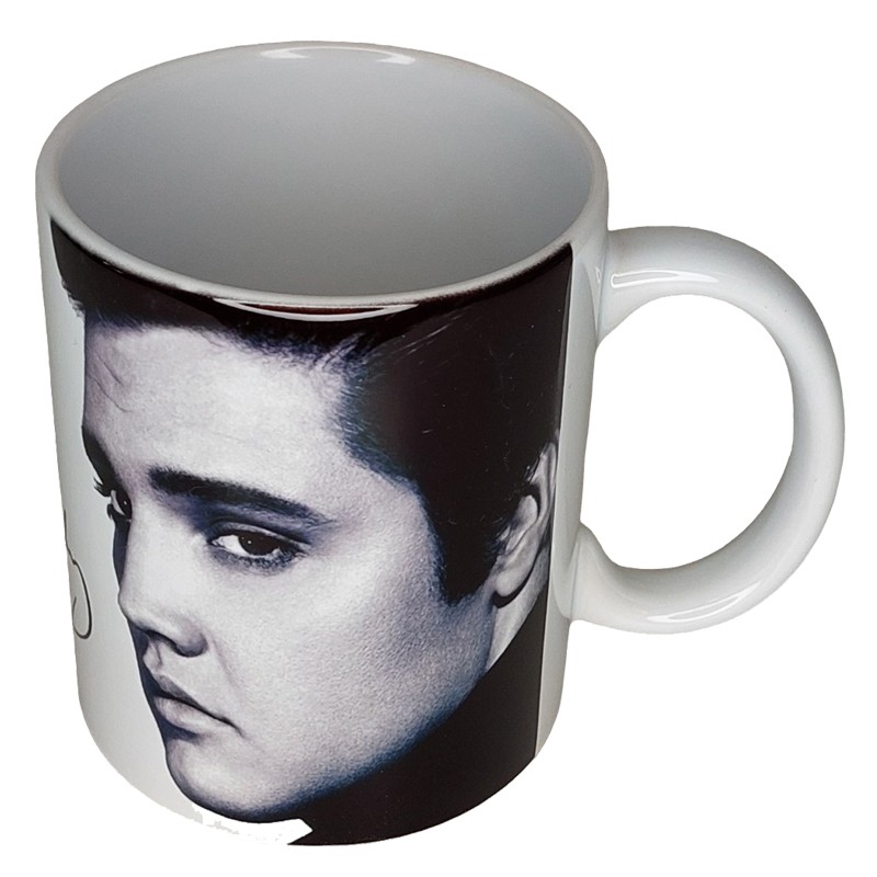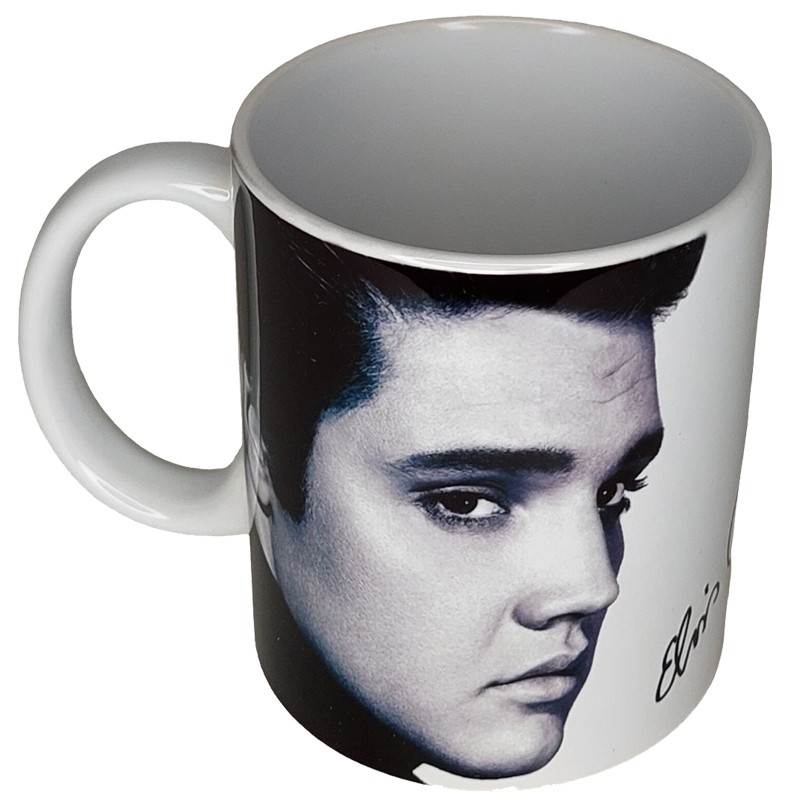 Tasokas posliinimuki jossa kuvituksena on legendaarinen Elvis-kuva ja nimmari.