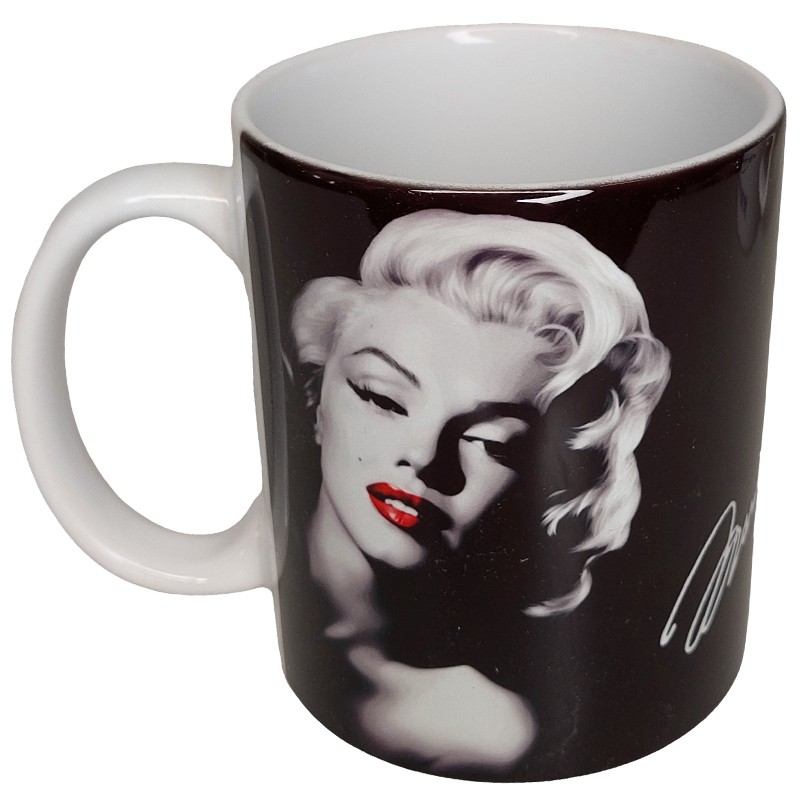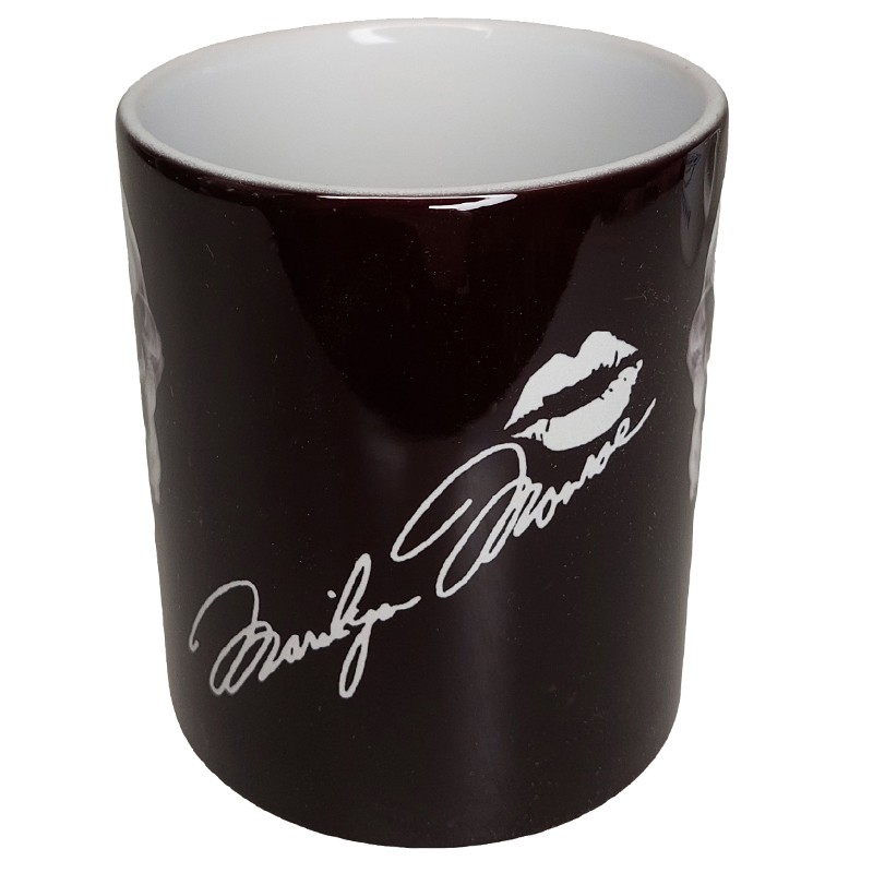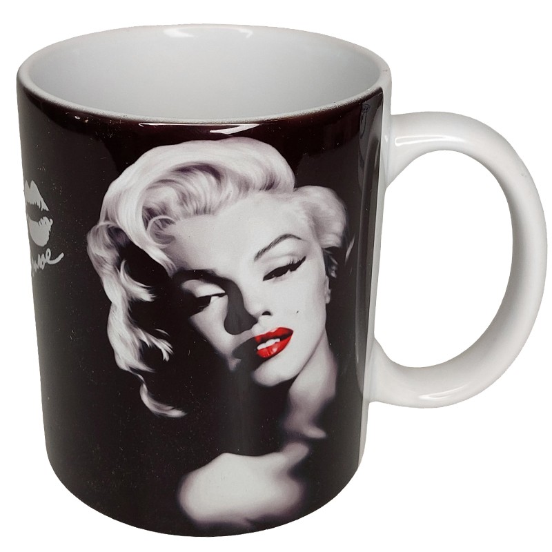 Tasokas posliinimuki jossa kuvituksena on legendaarinen Marilyn-kuva ja nimmari.
