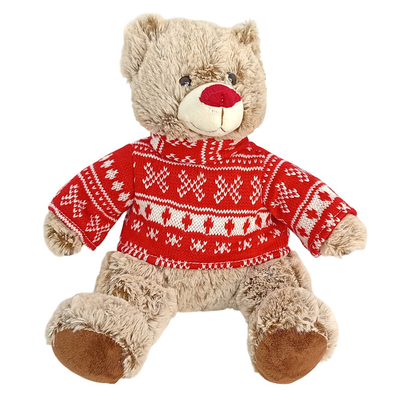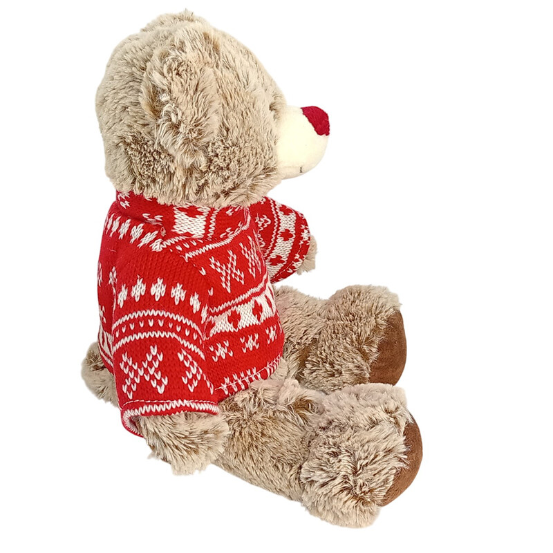 Suloisen pehmoinen istuva nalle, jolla on yllään kaunis villapaita.