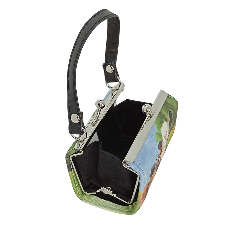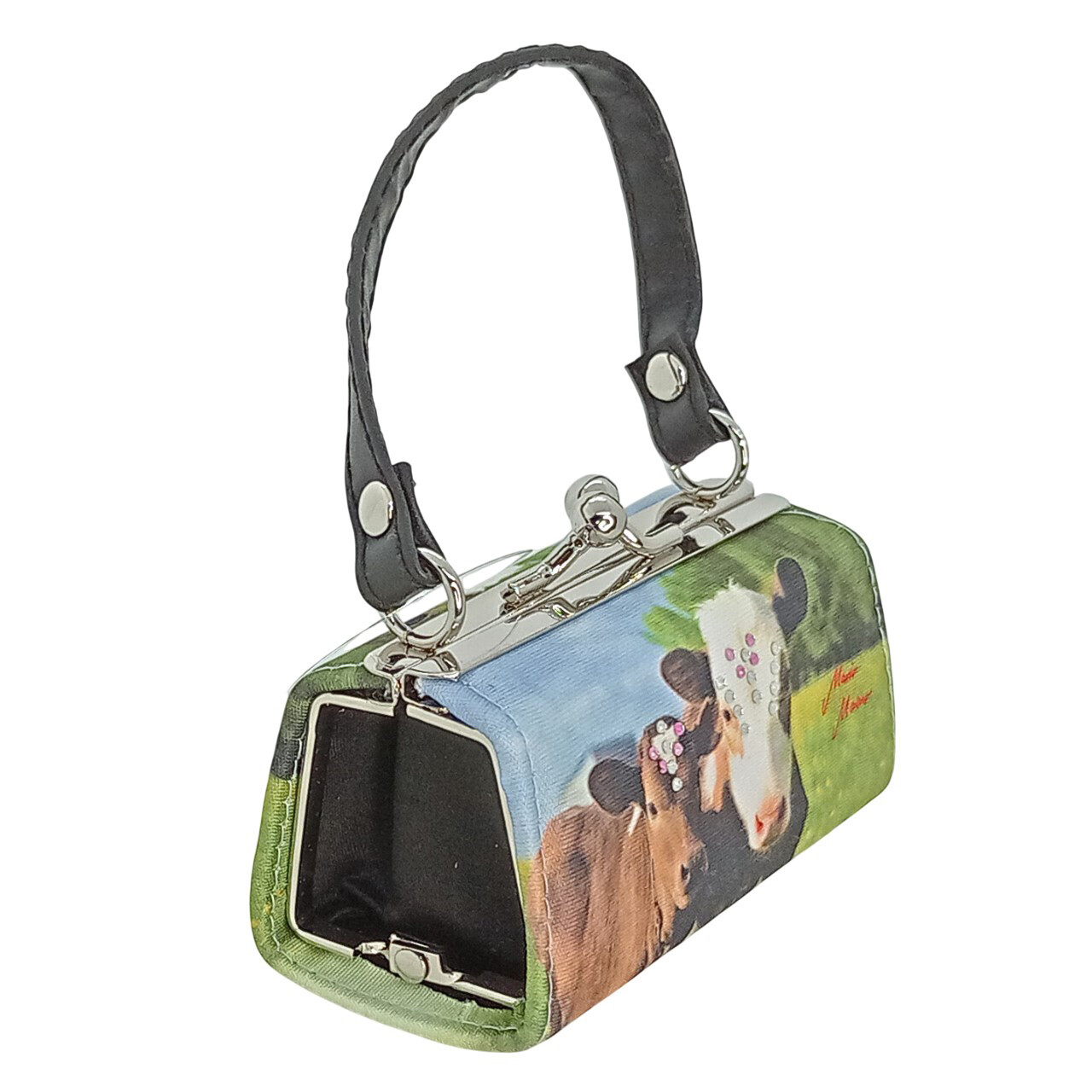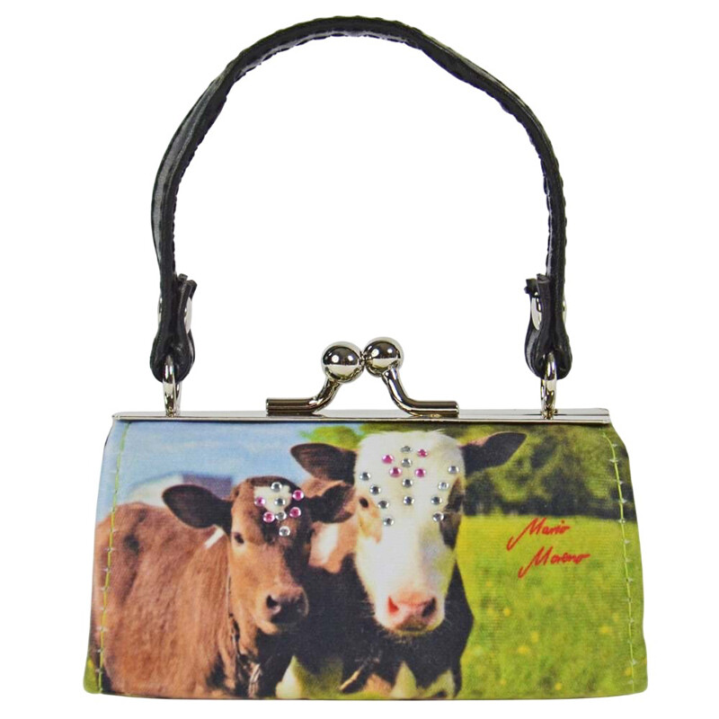 Pienessä käsilaukunmuotoisessa tekstiilipintaisessa laukussa on kahden lehmän kuva. Toisella puolella laukkua on lisänä timanttikoristeet, jotka tuovat kuviin lisää näyttävyyttä!