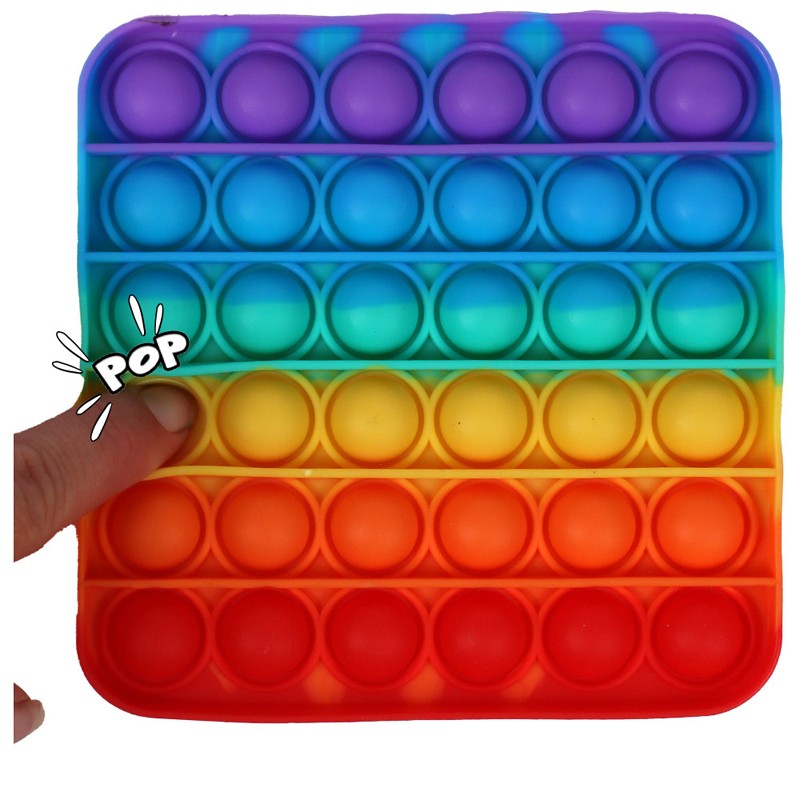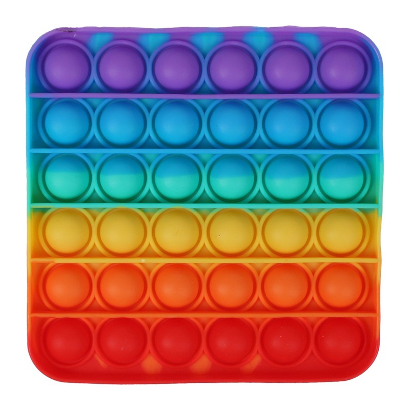 Neliönmuotoinen Pop It- lelu. Lelua poksautellaan kuin kuplamuovia. Kestävästä kumista tehtynä sitä voi poksautella uudestaan ja uudestaan.