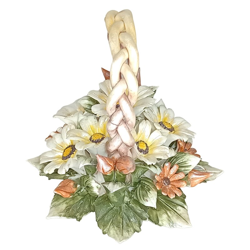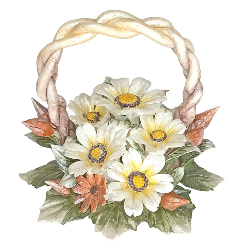 Päivänkakkara-asetelma, joka on käsintehtyä posliinia. Tuote kokonaisuudessaan lakattu. Huolellisesti pakattu kovaan lahjarasiaan.
