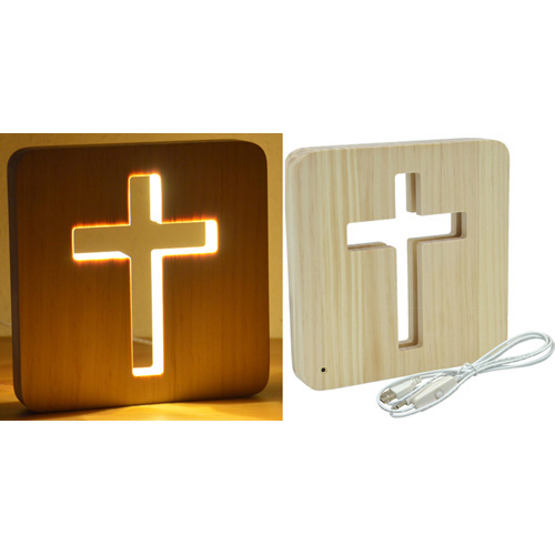 Puublokkiin on kaiverrettu kuvio jonne on asennettu LED-valo. Kuviona risti. Mukana tulee USB-kaapeli, jonka voi kytkeä tietokoneeseen, powerpankkiin, laturiin jne. Laturi ei tule mukana. Miellyttävä tunnelmavalaisin. Sopii myös yövaloksi.