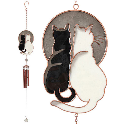 Kaunis kissat -tuulikello. Musta ja valkoinen lasinen kissa katsoo kuuta. Alareunaan on kiinnitetyissä tuulikelloissa on hempeä ääni.
