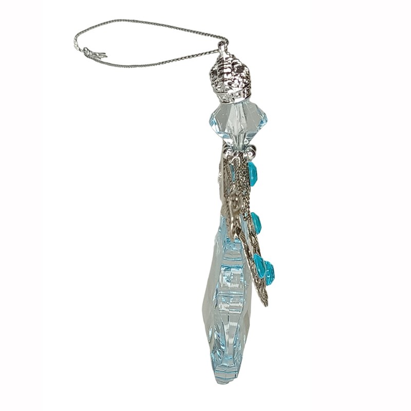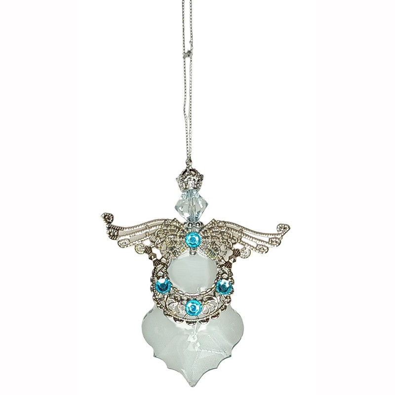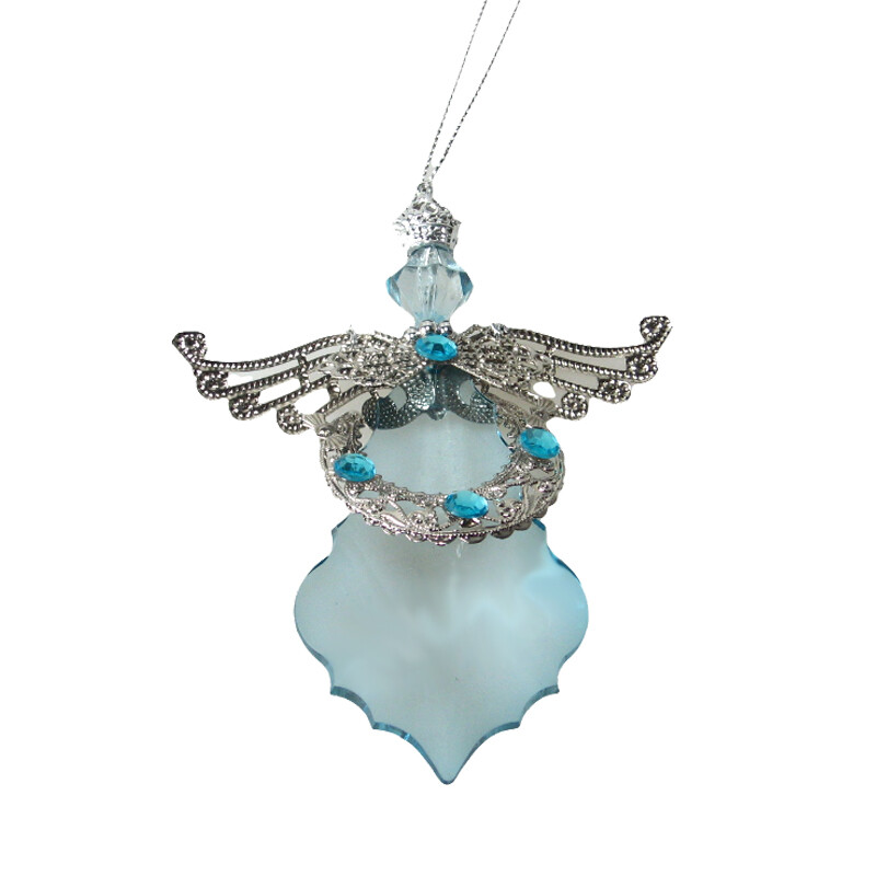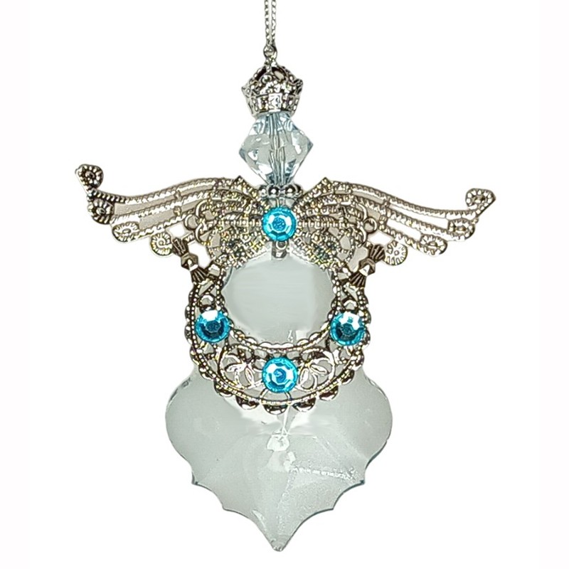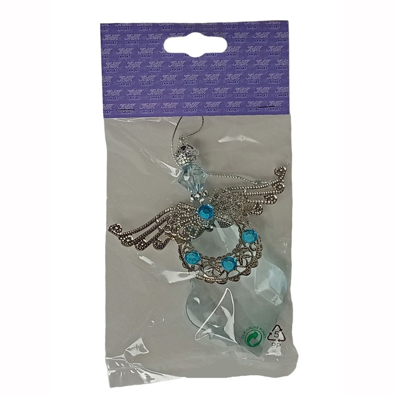 Kaunis tyylitelty riippuva enkeli. Enkelin helmana on sininen akryylilkristalli. Enkelin siivet ja muut somisteet hopeamaalattua metallia. Lisäkoristuksena on sinisiä akryylitimantteja. Tuotteessa on ripustusnauha valmiina.