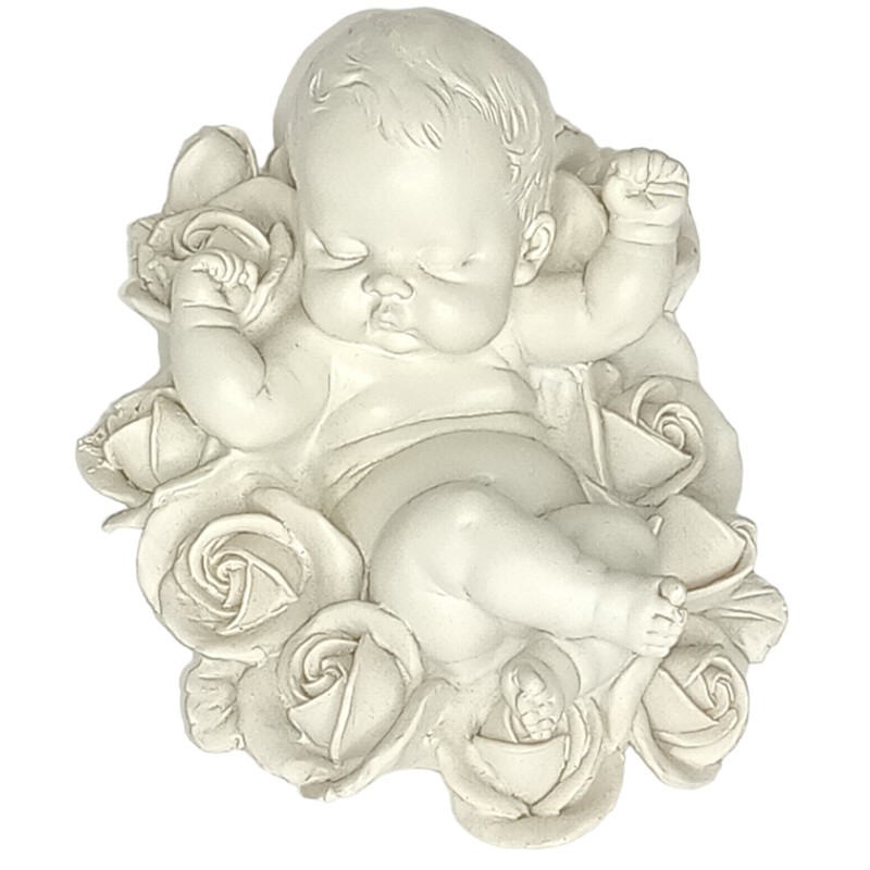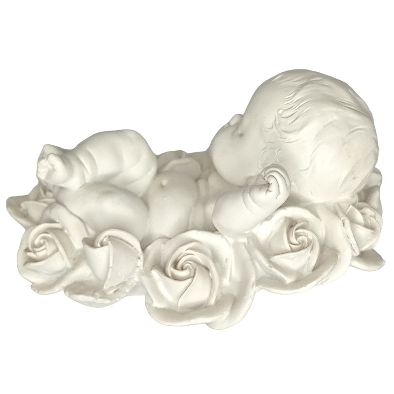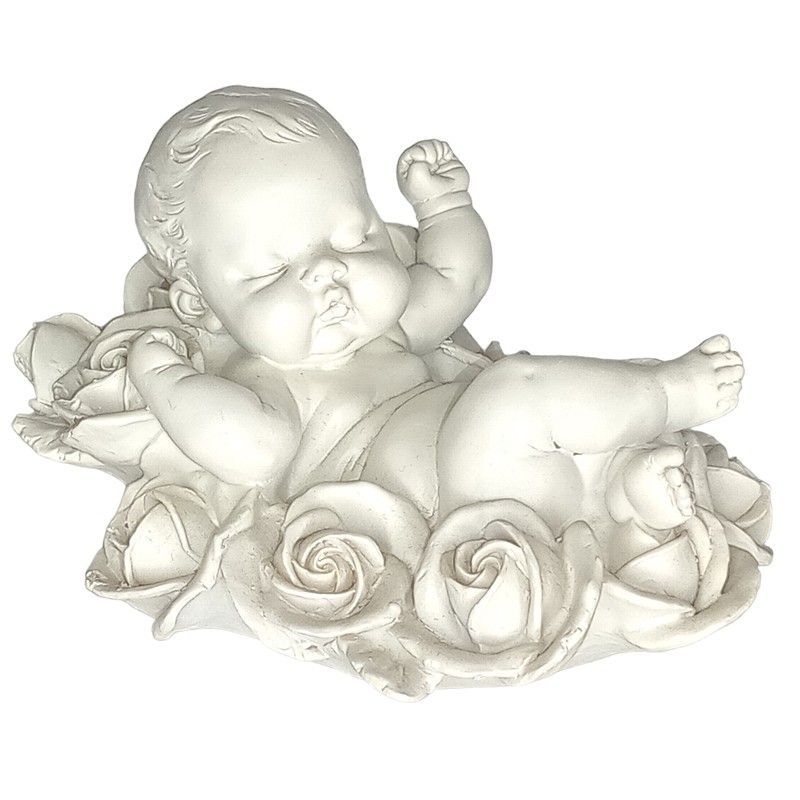 Suloinen pulleaposkinen vauva nukkuu ruusujen keskellä.