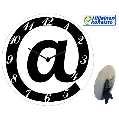 Kellotaulun kuvana on @ -merkki. Kellossa on seinäkiinnitys ja lisäksi mukana tulee pöytätuki, jonka avulla kellon voi laittaa pöydälle, kirjahyllyyn, ikkunalaudalle…