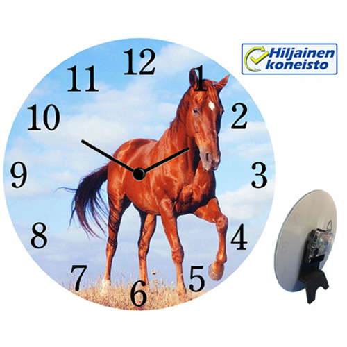 Seinäkellossa kuvana on vapaana kirmaava hevonen. Kellossa on seinäkiinnitys ja lisäksi mukana tulee pöytätuki, jonka avulla kellon voi laittaa pöydälle, kirjahyllyyn, ikkunalaudalle…