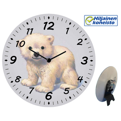 Kellossa on jääkarhun pennun kuva. Kellossa on seinäkiinnitys ja lisäksi mukana tulee pöytätuki, jonka avulla kellon voi laittaa pöydälle, kirjahyllyyn, ikkunalaudalle…