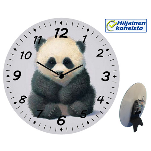 Kellossa Pyry-pandan kuva. Kellossa on seinäkiinnitys ja lisäksi mukana tulee pöytätuki, jonka avulla kellon voi laittaa pöydälle, kirjahyllyyn, ikkunalaudalle…