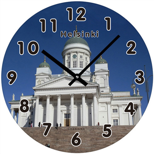 Seinäkellossa on komea kuva Helsingin tuomiokirkosta.
