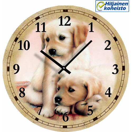 Seinäkellossa on kuva kahdesta koiranpennusta.