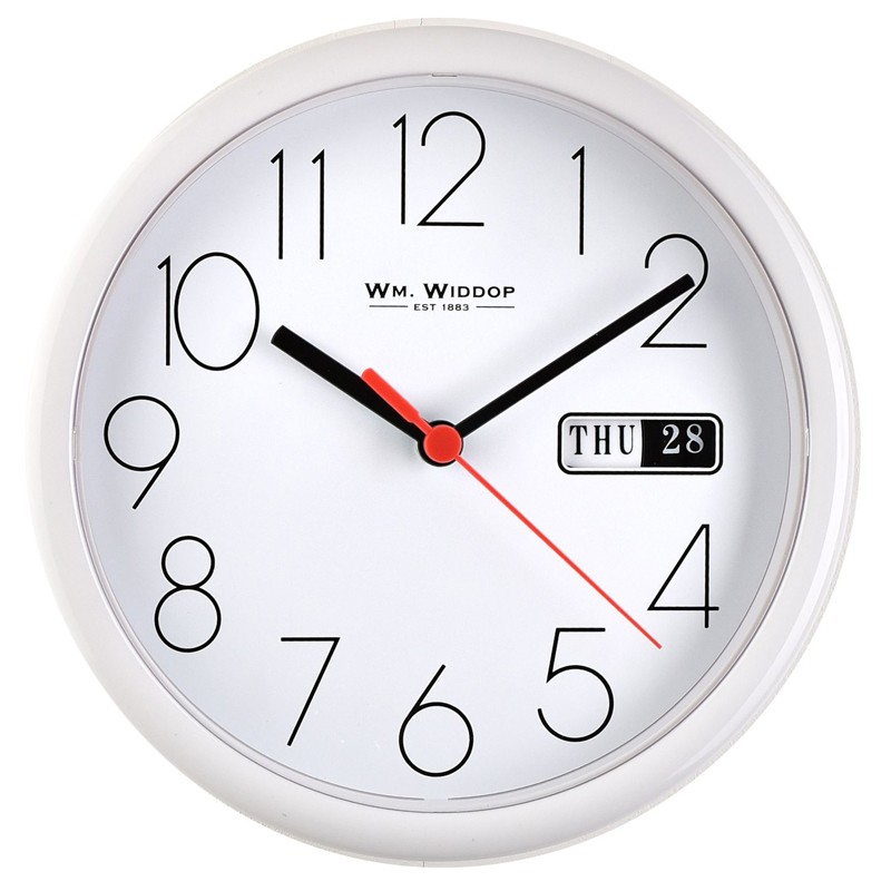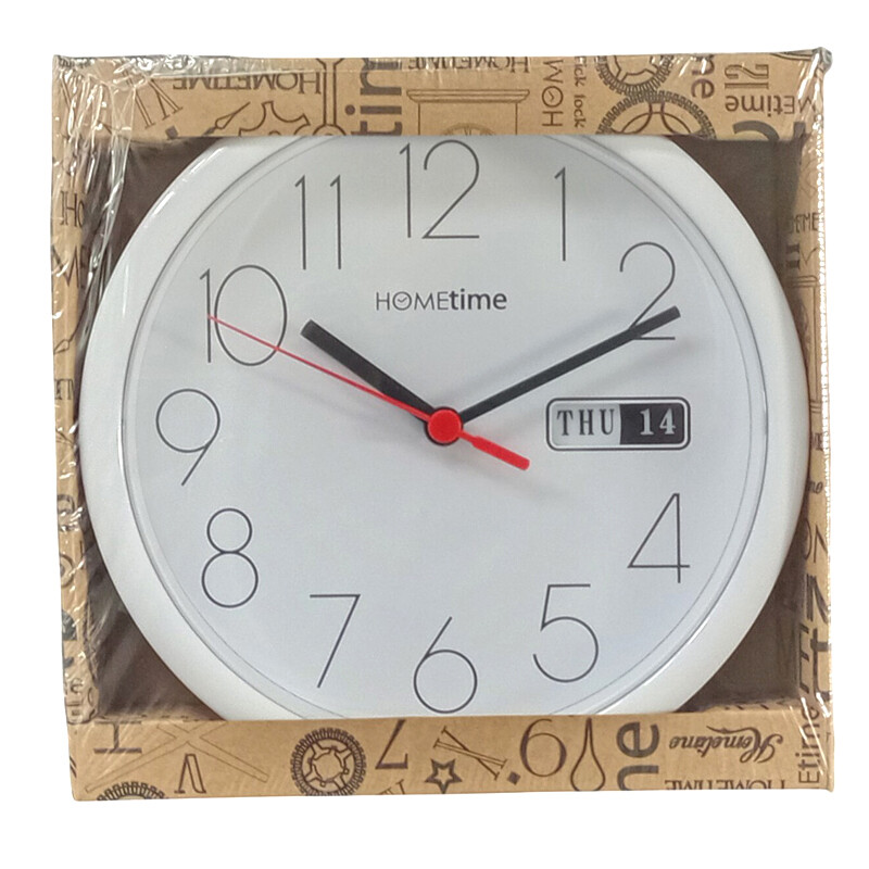 Selkeä seinäkello, jossa päivyri. Päivyrissä englanninkielinen viikonpäivä ja monesko kuukauden päivä on. Kellotaulu on lasin suojassa.