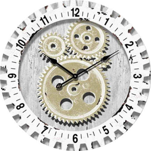 Seinäkellossa kuvana rattaita jos jonkinlaisia.