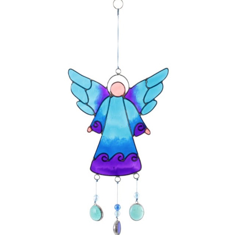 Tiffanytekniikalla toteutettu enkeliriipus. Enkelissä riippuu kolme eriväristä lasikoristetta.