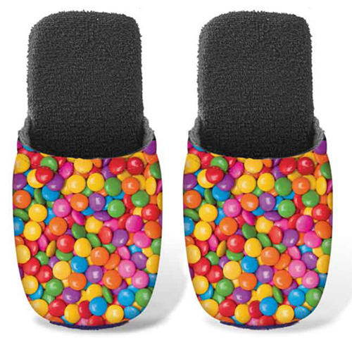 Mukavat kotitossut sisäkäyttöön. Pehmustetut pohjat, joten miellyttävät kovallakin alustalla. Likaa hylkivä pinta. Tossujen kuvana on paljon, paljon namia. Ei lihota.
