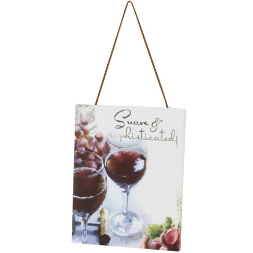 Canvas-tyylinen taulu, jossa kuvattuna viinilasit ja viinirypäleitä ja teksti ”Suave & sophisticated”.