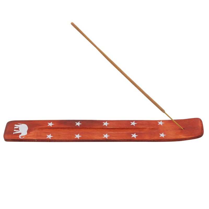 Suitsuketikun polttamiseen tarkoitettu puinen alusta. Koristeena elefantin kuva.