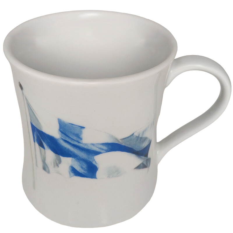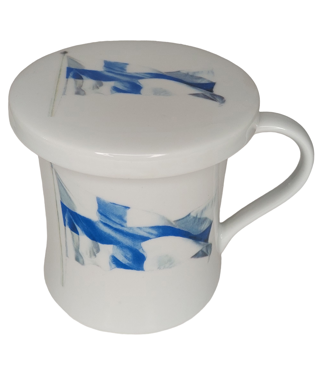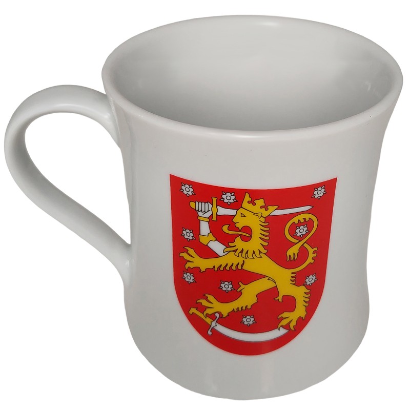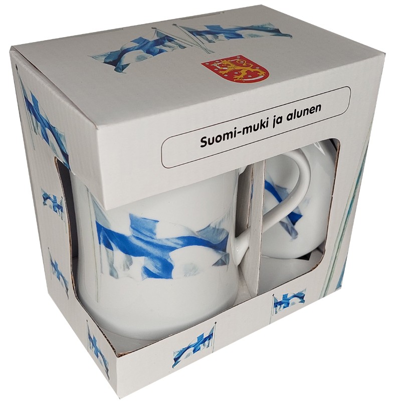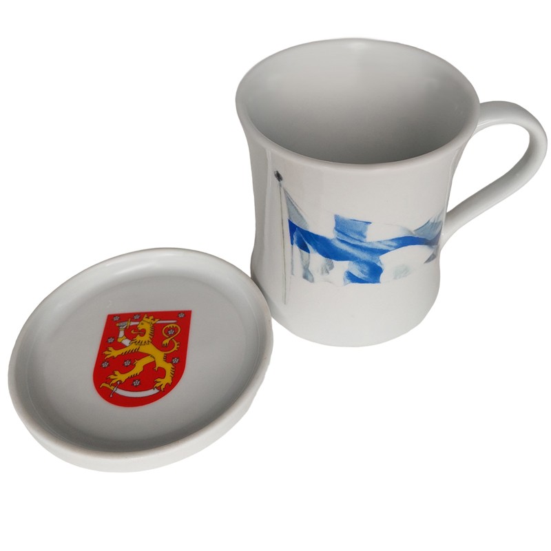 Tukevan ja laadukkaan mukin ja alusen kuvituksena on Suomen lippu ja Leijona-vaakuna. Mukin alusta voi käyttää mukin kantena.