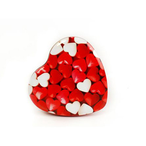 Sydämenmuotoinen peltirasia jonka kuva-aiheena punaiset ja valkoiset sydämet.