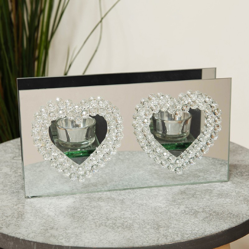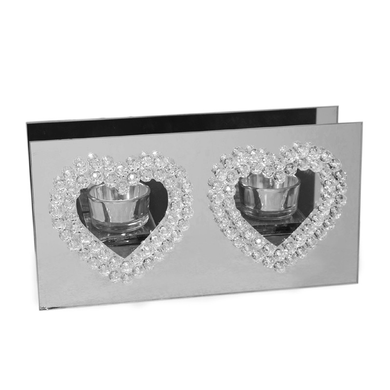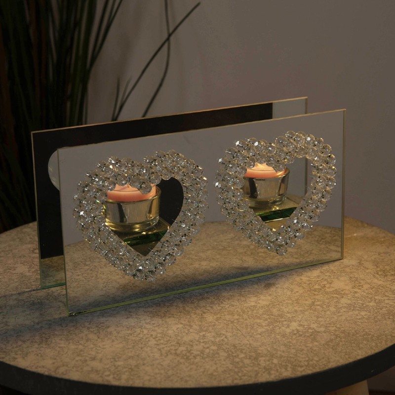 Lasinen tuikkualunen, jonka etusivulla on koristeena kaksi sydäntä. Sydänkuviot on tehty pienistä lasitimanteista. Etu- ja takaseinä ovat peililasia. Lasinen kiinteä tila tuikulle. Antaa kauniin, tunnelmallisen valon. Tilaa kahdelle lämpökynttilälle.