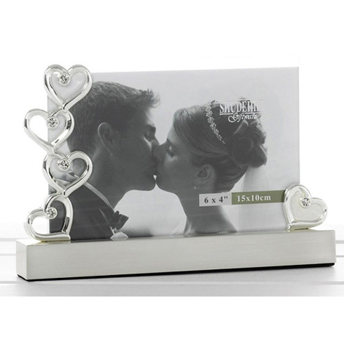 Upea hopeoitu kehys, jonka vasemmassa reunassa kulkee kimaltelevin kivin koristellut sydämet.