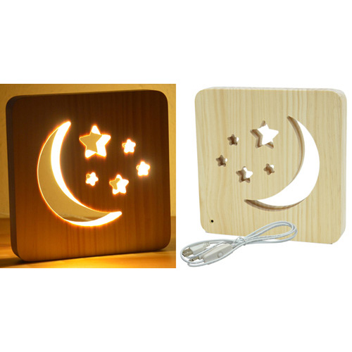Puublokkiin on kaiverrettu kuvio jonne on asennettu LED-valo. Kuviona kuu ja tähtiä. Mukana tulee USB-kaapeli, jonka voi kytkeä tietokoneeseen, powerpankkiin, laturiin jne. Laturi ei tule mukana. Miellyttävä tunnelmavalaisin esim. lastenhuoneen yövaloksi.