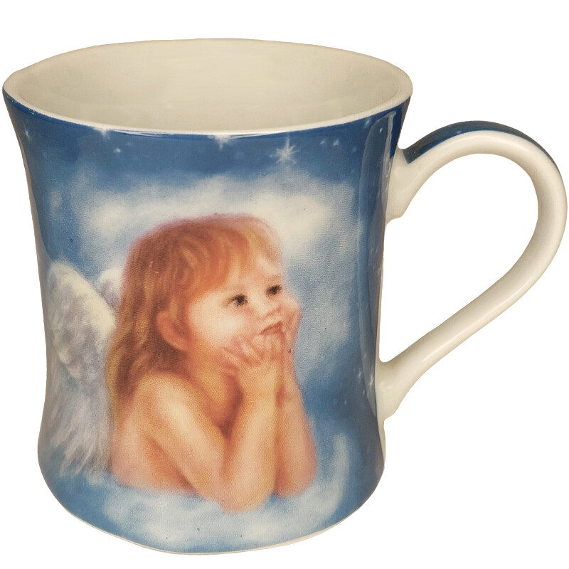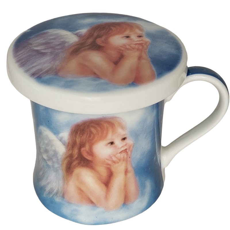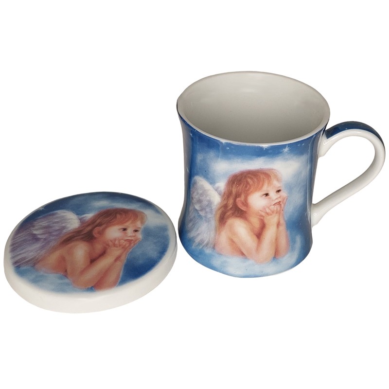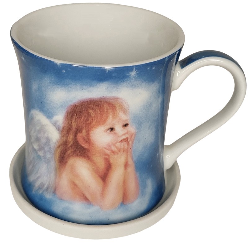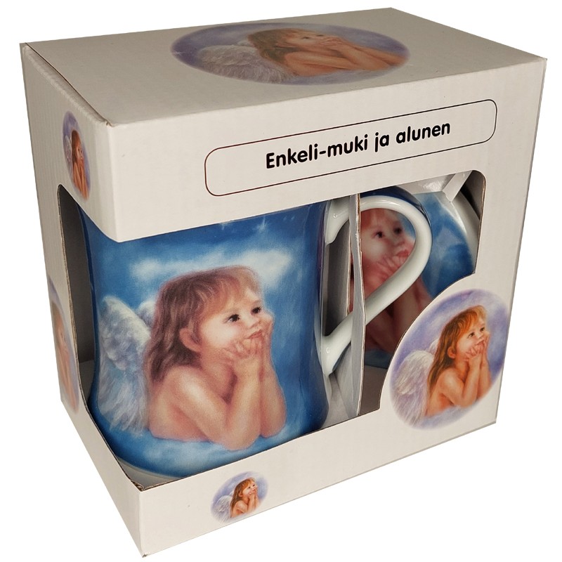 Enkelilapsi muki ja alunen. Mukin alusta voi käyttää myös mukin kantena.