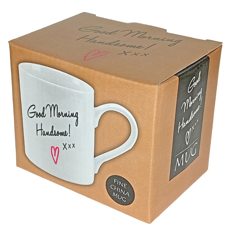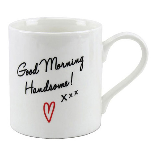 Mukin molemmilla puolilla teksti ”Good Morning Handsome!