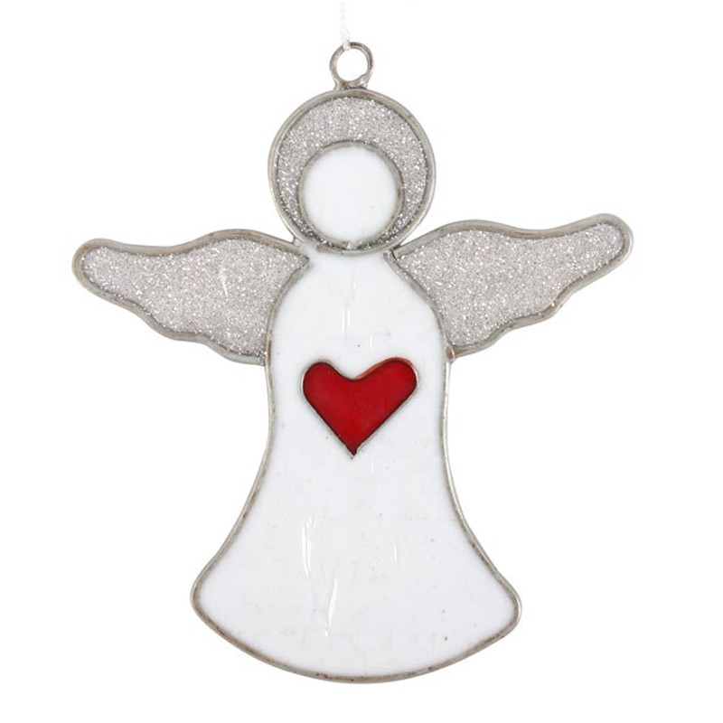 Kaunis tiffanytekniikalla toteutettu enkeli. Tägissä teksti ”Always with you”.