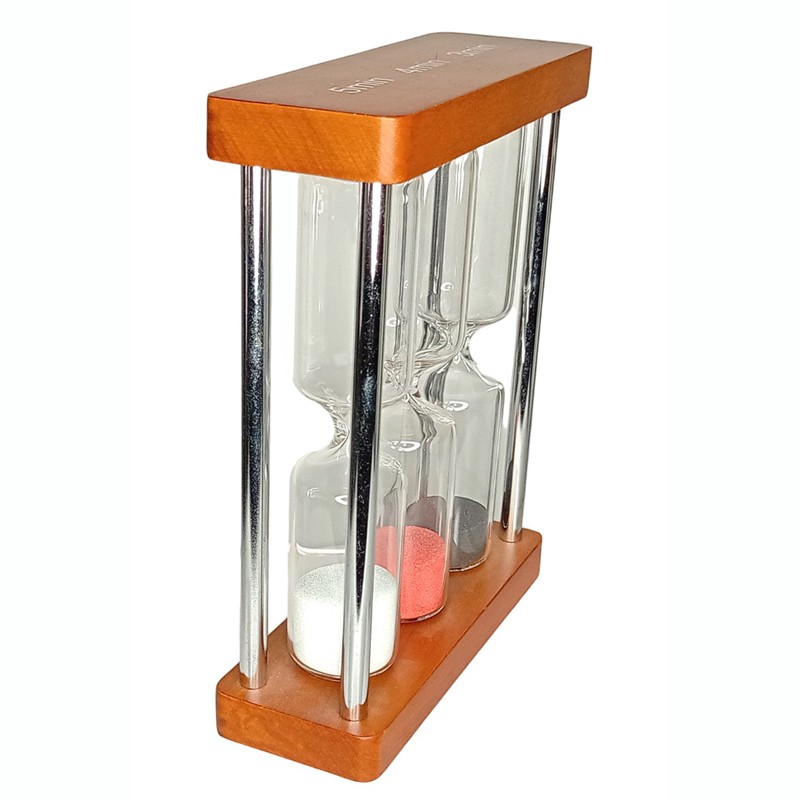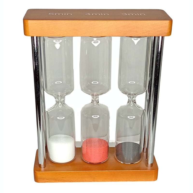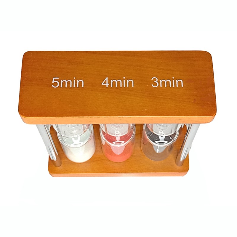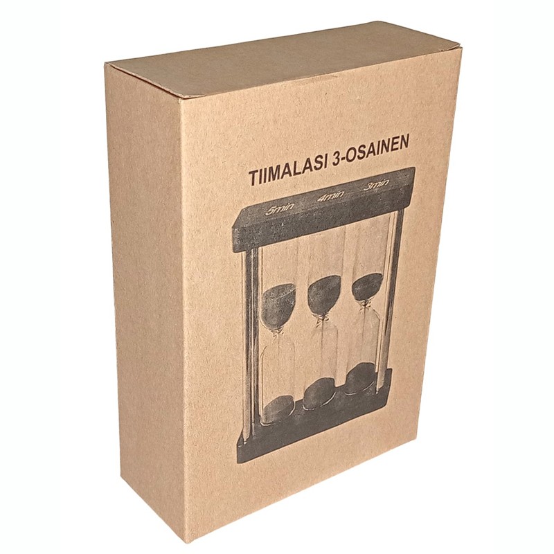 Näin mitattiin ennenvanhaan aikaa. Tässä tuotteessa on 3 tiimalasia. Hiekan valumisajat 3 min, 4 min. ja 5 min. Jokaisessa on erivärinen hiekka.