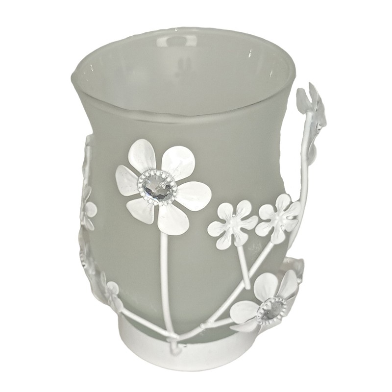 Kaunis pehmeälinjainen lasimalja, joka on asetettu metallisen ”timantti”-kukin koristellun kehikon sisään.
