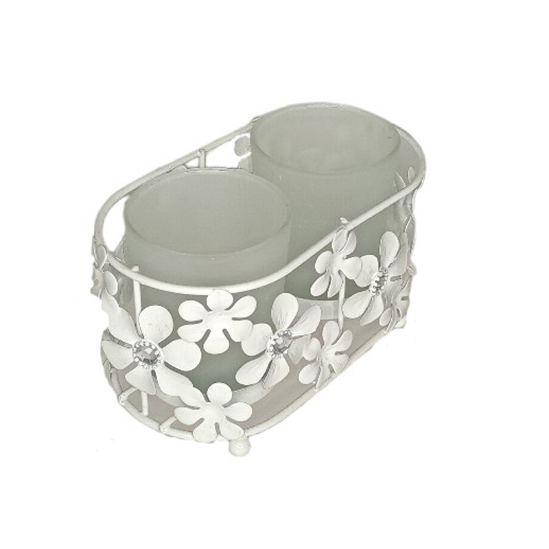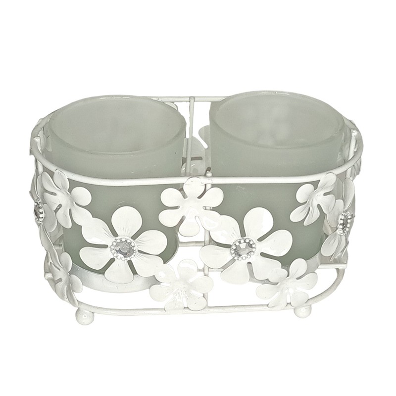 Siro lasinen ja himmeäpintainen tuikkualunen, jossa metallisten kukka-somisteiden keskellä on ”timantteja”.