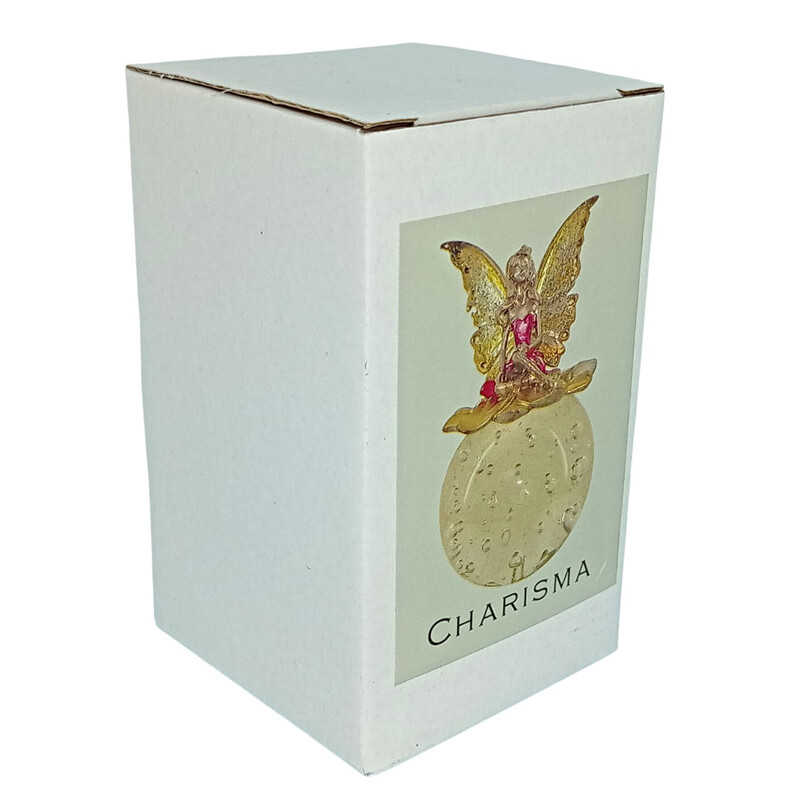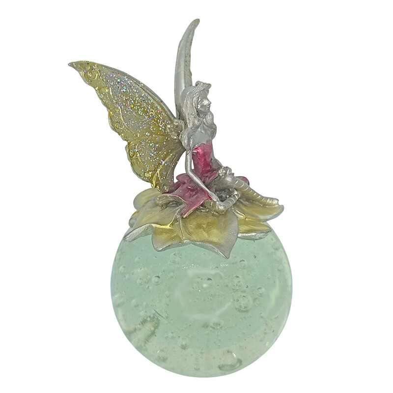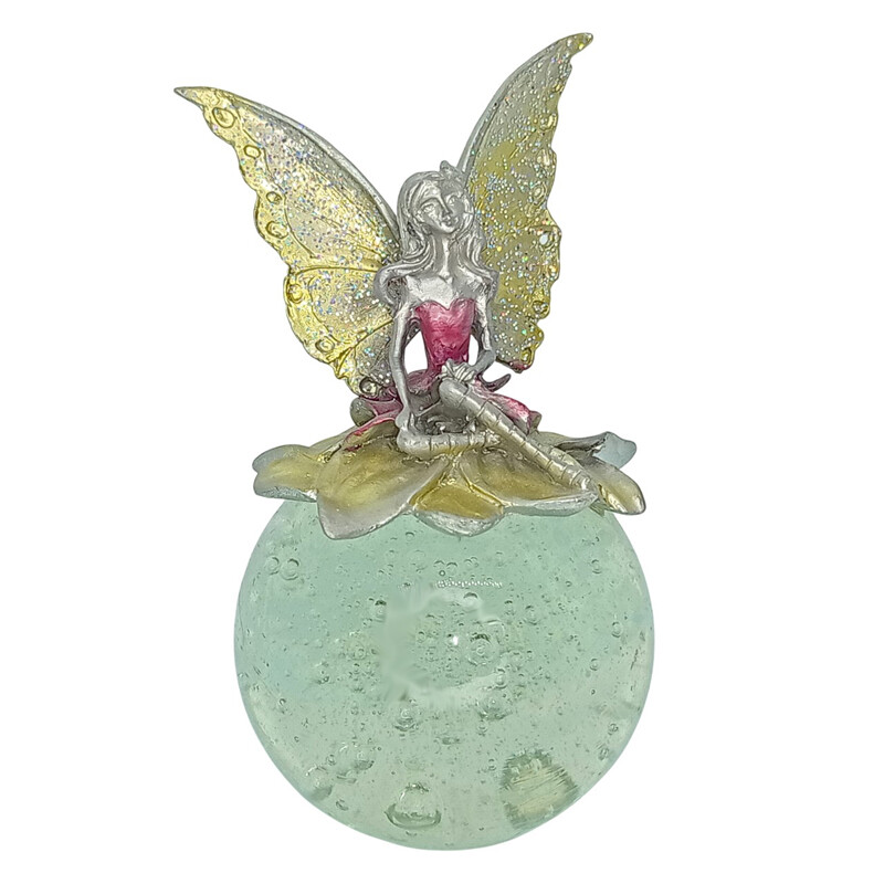 Keiju istuu lehdellä lasipallon päällä, jossa on ilmakuplia sisällä. Keijun siivissä ja mekossa on väriä ja kimaletta.