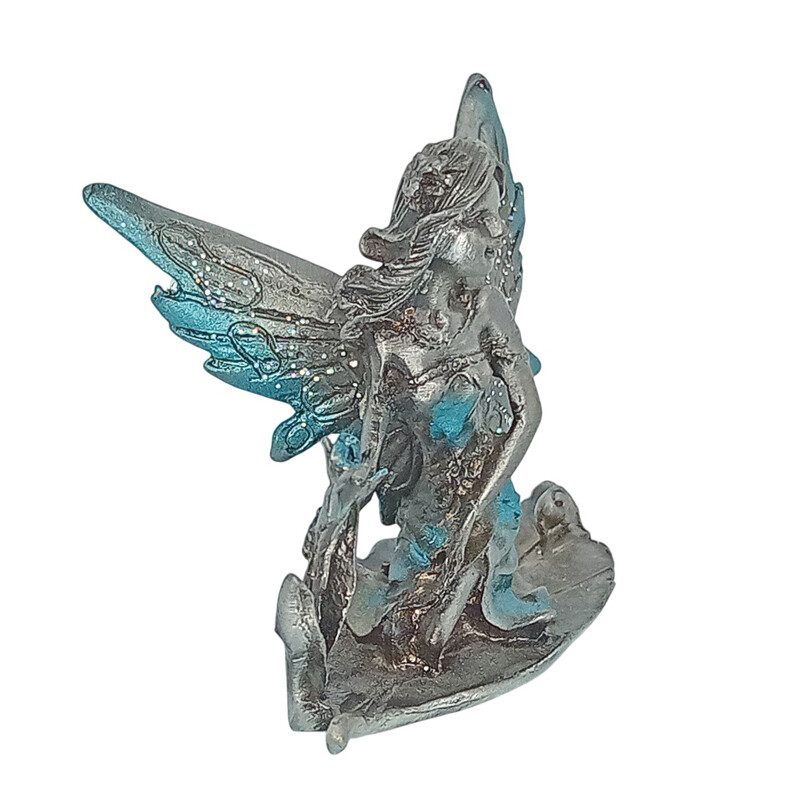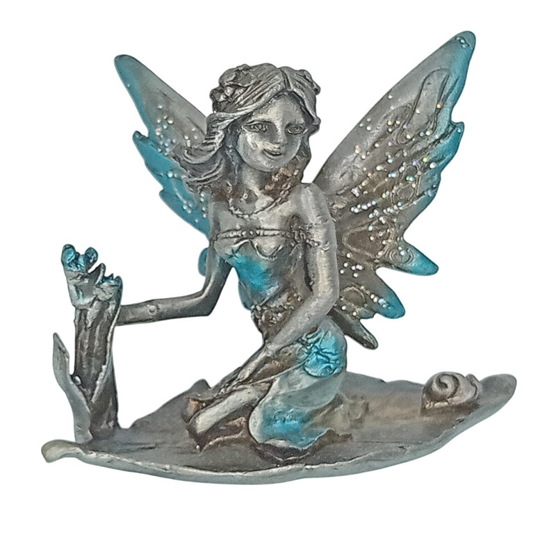 Kokonaan tinasta valmistettu kaunis keiju. Keiju on polvillaan lehden päällä ja etana siinä vierellään. Siivissä turkoosia väriä ja kimalletta.