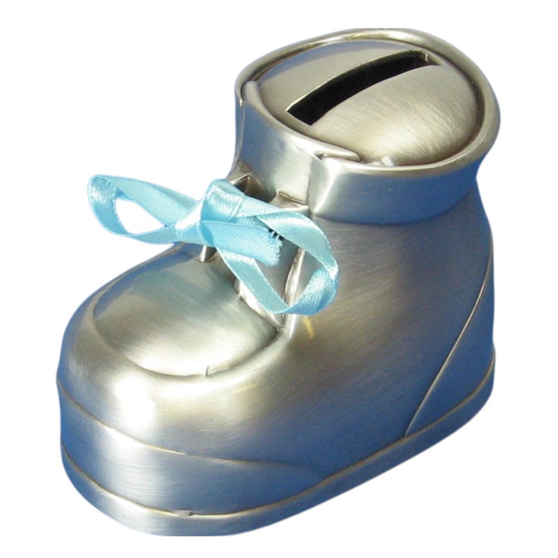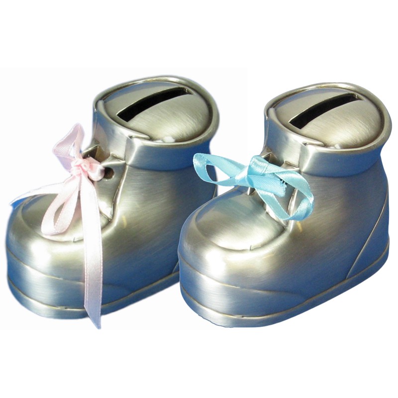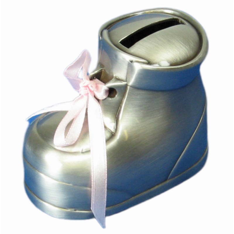 Vauvantossu -säästölipas. Mukava tulee pinkki ja sininen tossunnauha.