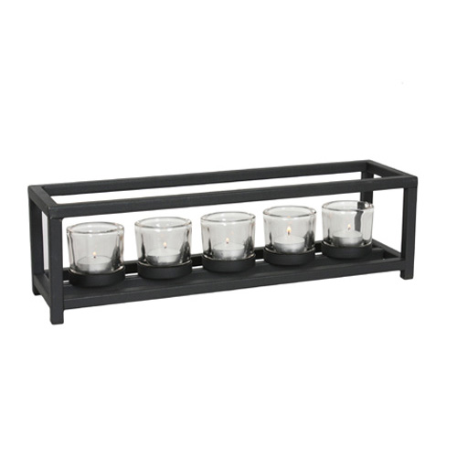 Paksusta mustasta metalliputkesta tehty kehikko jossa on viisi paikkaa tukuille. Tuikkukupit ovat paksu, kirkasta lasia.