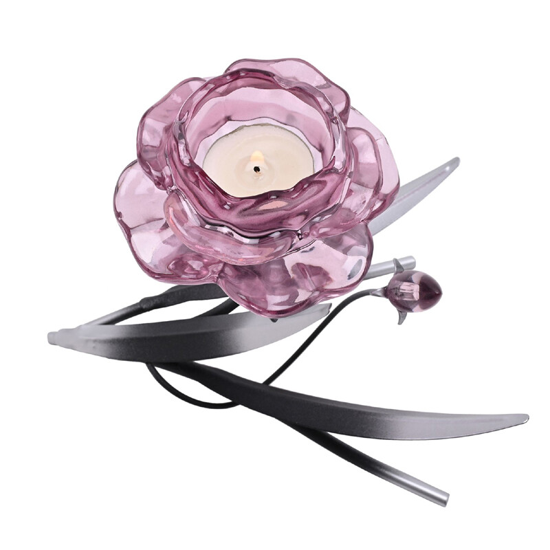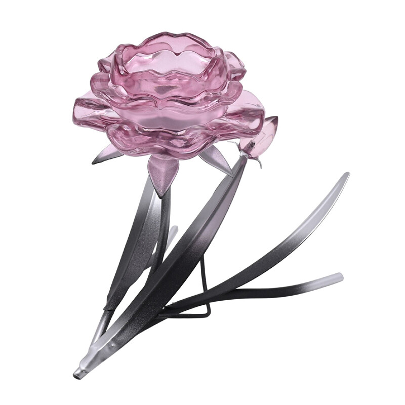 Upea kukanmuotoinen tuikkualunen. Metallinen kukan varsi ja lehdet. Pinkinvärinen, lasinen kukka, joka toimii tuikkukuppina. Kuvassa näkyvä lämpökynttilä ei tule mukana.