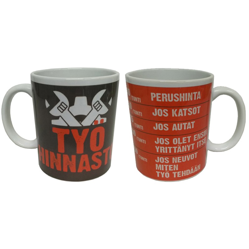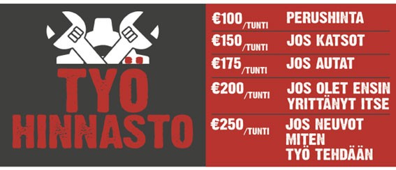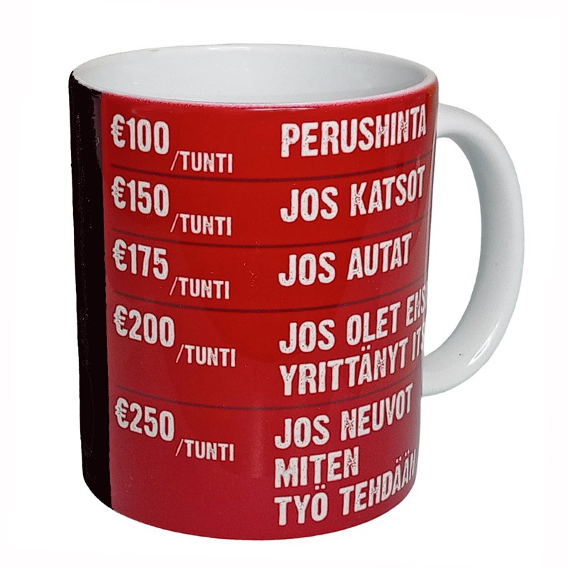 Muki, jossa hauskat tuntihinnat erilaisille työsuorituksille.