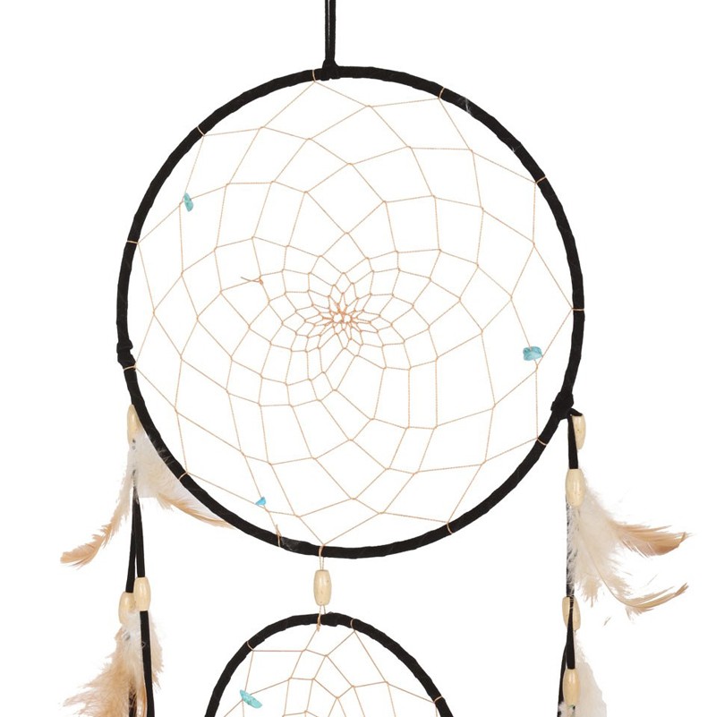 3-kehäinen unisieppari. Kehiltä lähtee koristenauhoja, joissa koristeina ”helmiä” ja aitoja höyheniä.