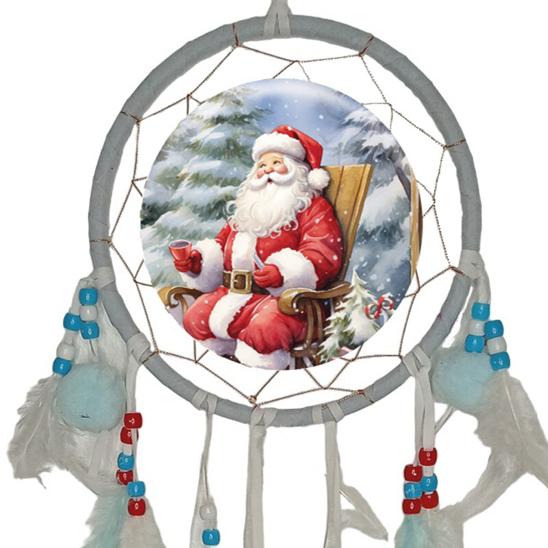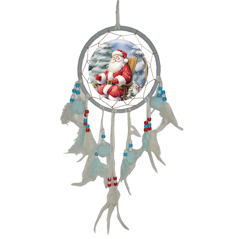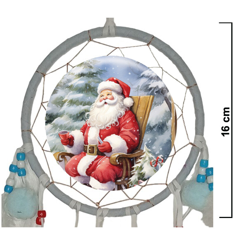Siniharmaalla tekstiilillä päällystetty kehä. Kuvassa iloinen joulupukki. Kehältä lähtee useasta eri kohdin nahkanauhoihin kiinnitettyjä höyhennippuja ja helmiä.