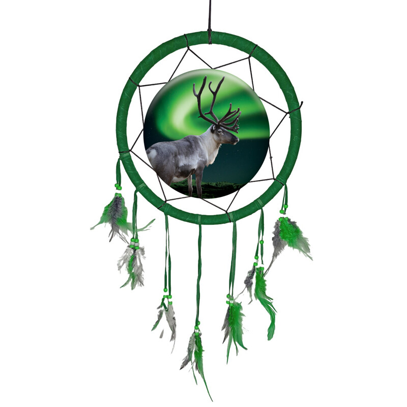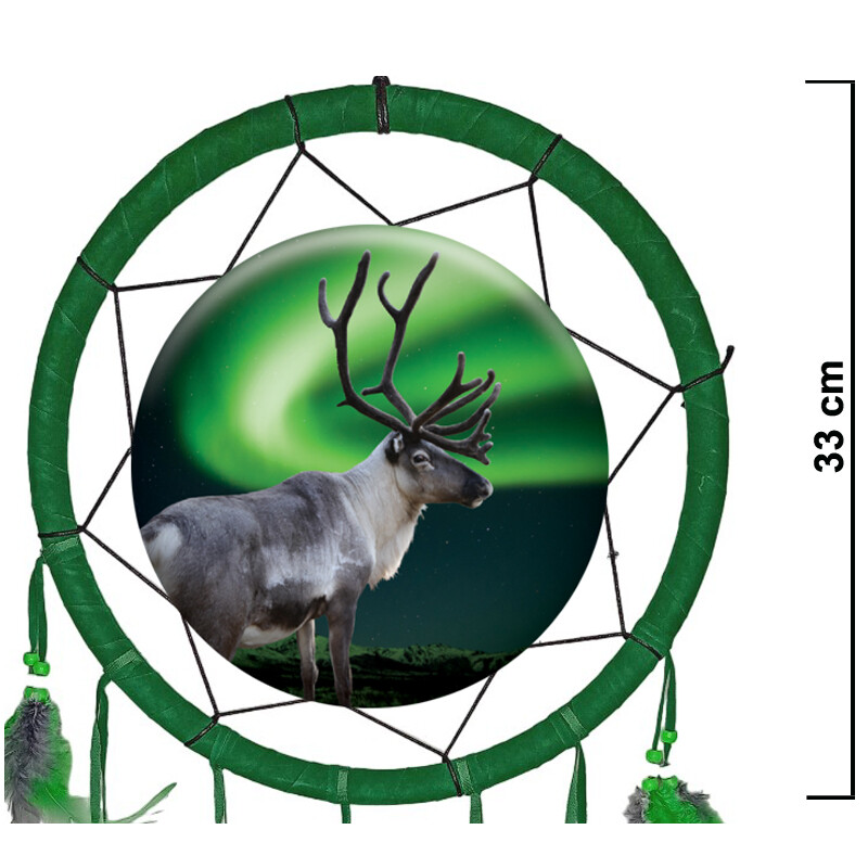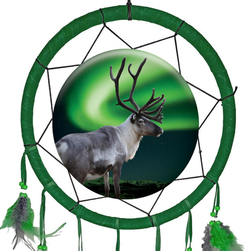 Tummanvihreällä tekstiilillä päällystetty kehä. Kuvassa on poro taustana komeat revontulet. Kehältä lähtee useasta eri kohdin nahkanauhoihin kiinnitettyjä höyhennippuja ja helmiä.