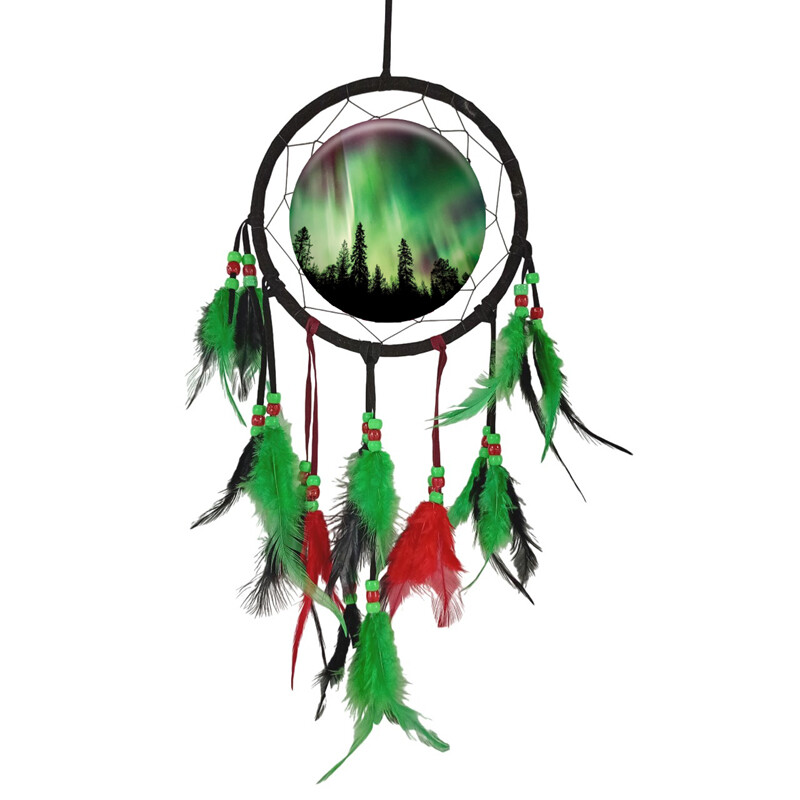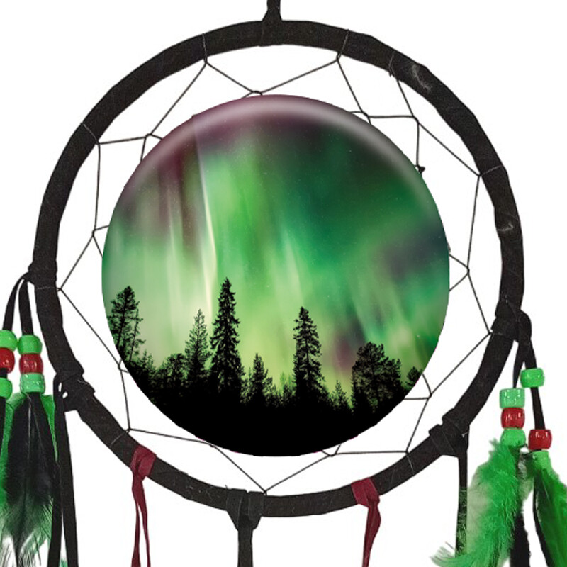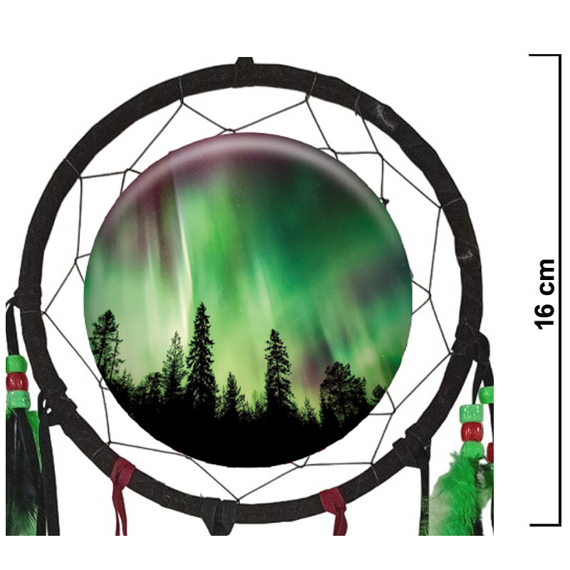 Mustalla tekstiilillä päällystetty kehä. Näyttävä revontulet -kuva. Kehältä lähtee useasta eri kohdin nahkanauhoihin kiinnitettyjä höyhennippuja ja helmiä.