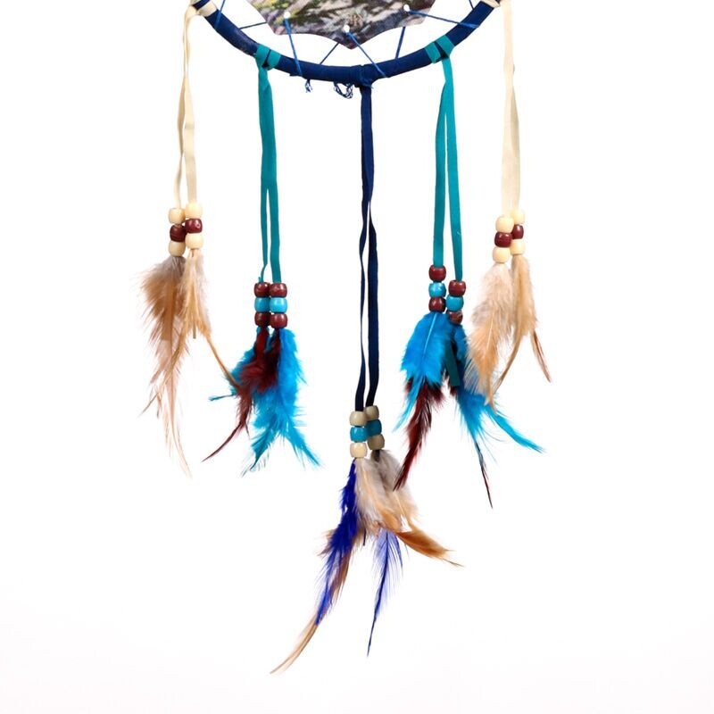Tummanpunaisella tekstiilillä päällystetty kehä. Kuvassa susi ja keiju metsämaisemassa. Kehään on kiinnitetty viisi riippuvaa nahkanauhaa, joissa on aidot höyhenet ja helmikoristeet.